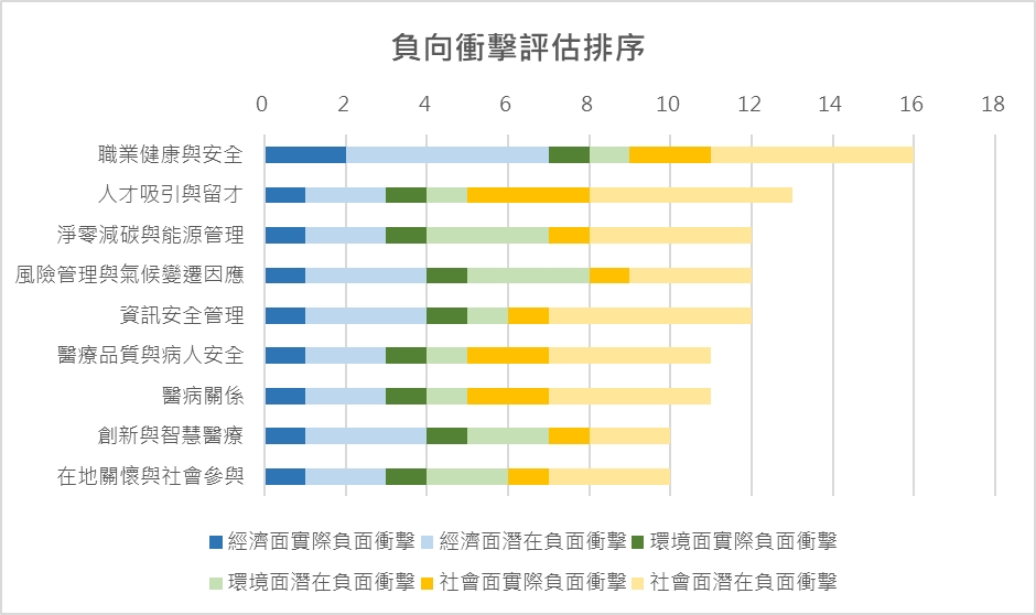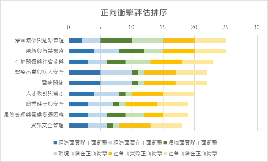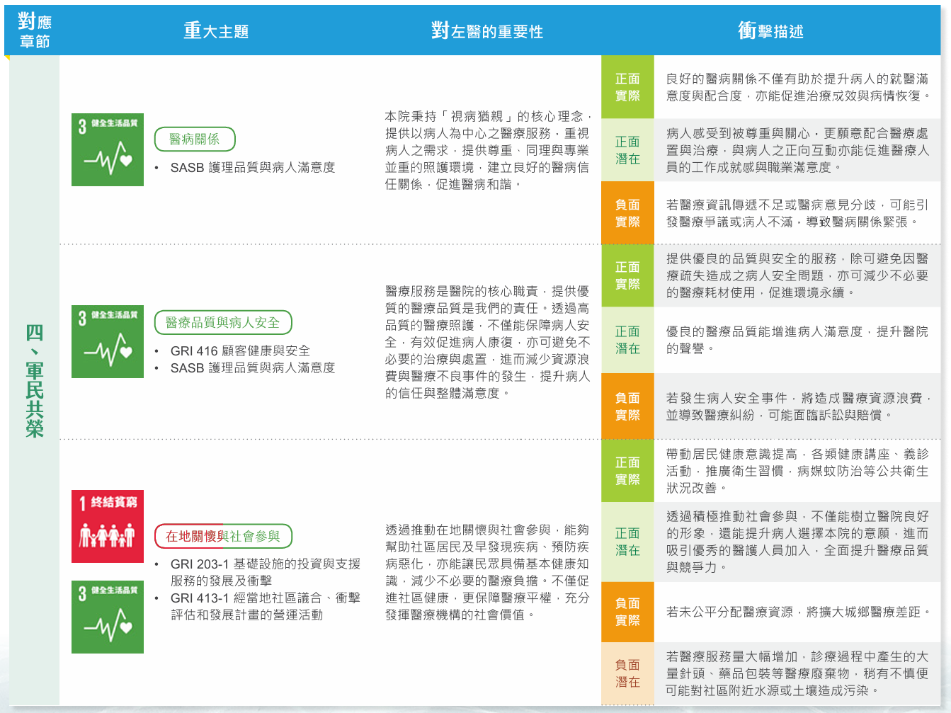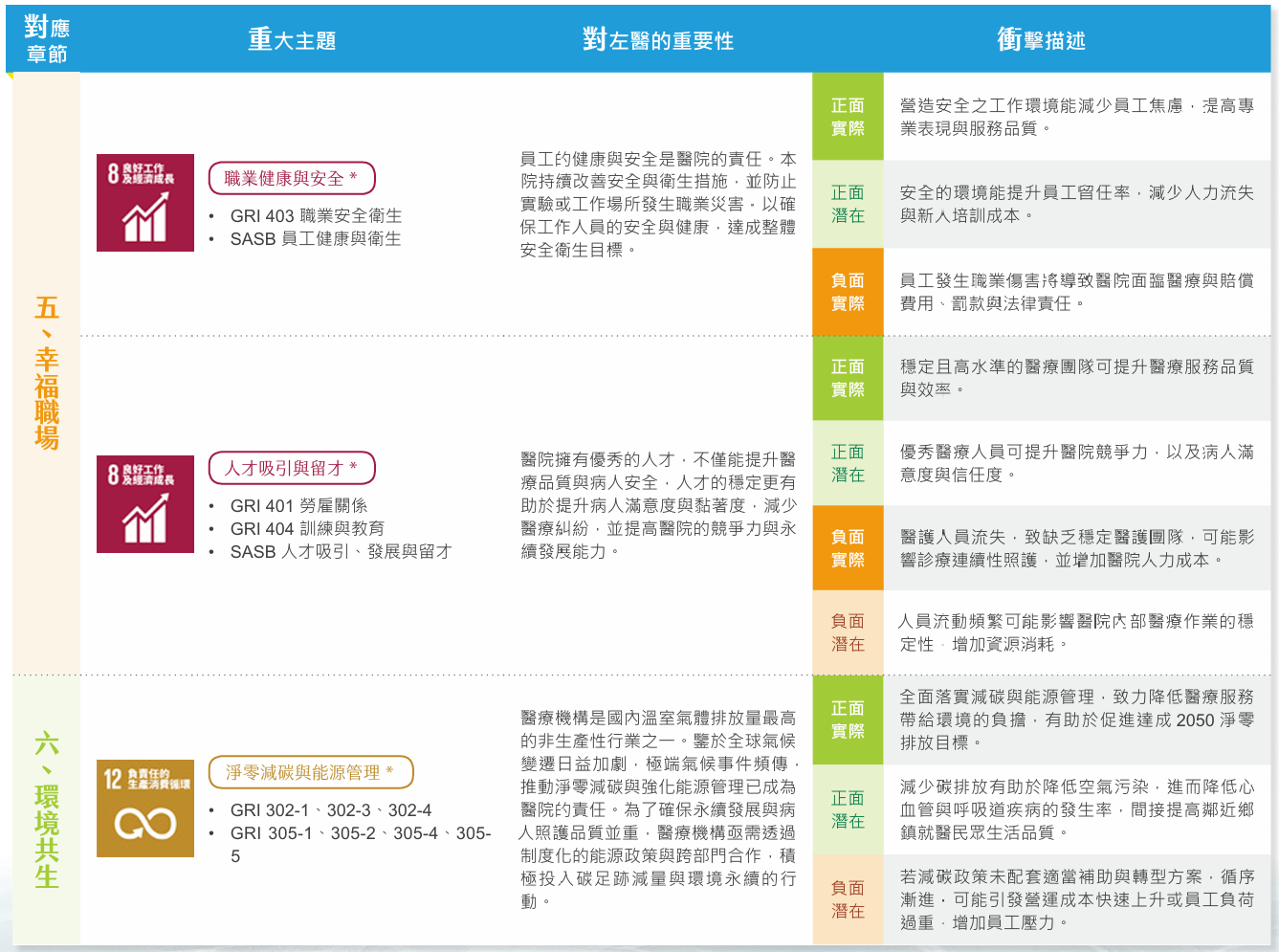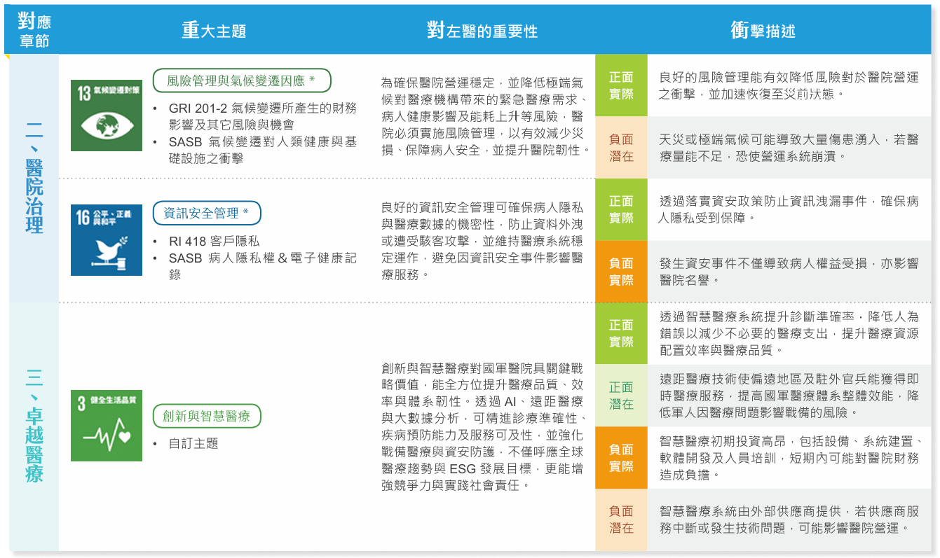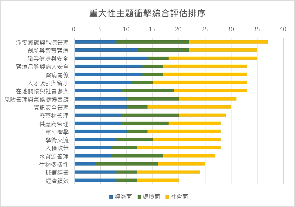 本院依循全球報告倡議組織(GRI)2021年發布之《GRI 3:重大主題》準則,並參考永續會計準則委員會(SASB)之行業標準,結合醫院營運方向與利害關係人關注議題,導入重大性分析流程。經過系統性鑑別,確定以下九項重大主題,作為本院永續發展策略之核心:「淨零減碳與能源管理」、「創新與智慧醫療」、「職業健康與安全」、「醫療品質與病人安全」、「醫病關係」、「人才吸引與留才」、「在地關懷與社會參與」、「風險管理與氣候變遷因應」、「資訊安全管理」。