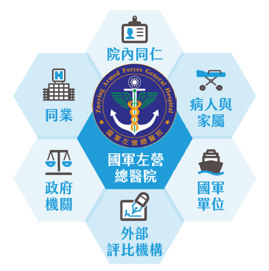 左醫依循全球非營利組織 AccountAbility 所制定之 AA1000 利害關係人議合標準(AA1000 Stakeholder Engagement Standard, AA1000 SES),採納其五大原則:依賴性(Dependency)、責任性(Responsibility)、影響力(Influence)、多元觀點(Diverse Perspectives)與關注張力(Tension)。本院由14位核心主管組成評估小組,透過問卷評分及深入討論,鑑別出六大主要利害關係人:院內同仁、病人與家屬、國軍單位、外部評比機構、政府機關與同業。此鑑別結果為本院永續發展策略與溝通機制的基礎,確保各方關注與期望能有效納入醫院治理與營運決策中。
