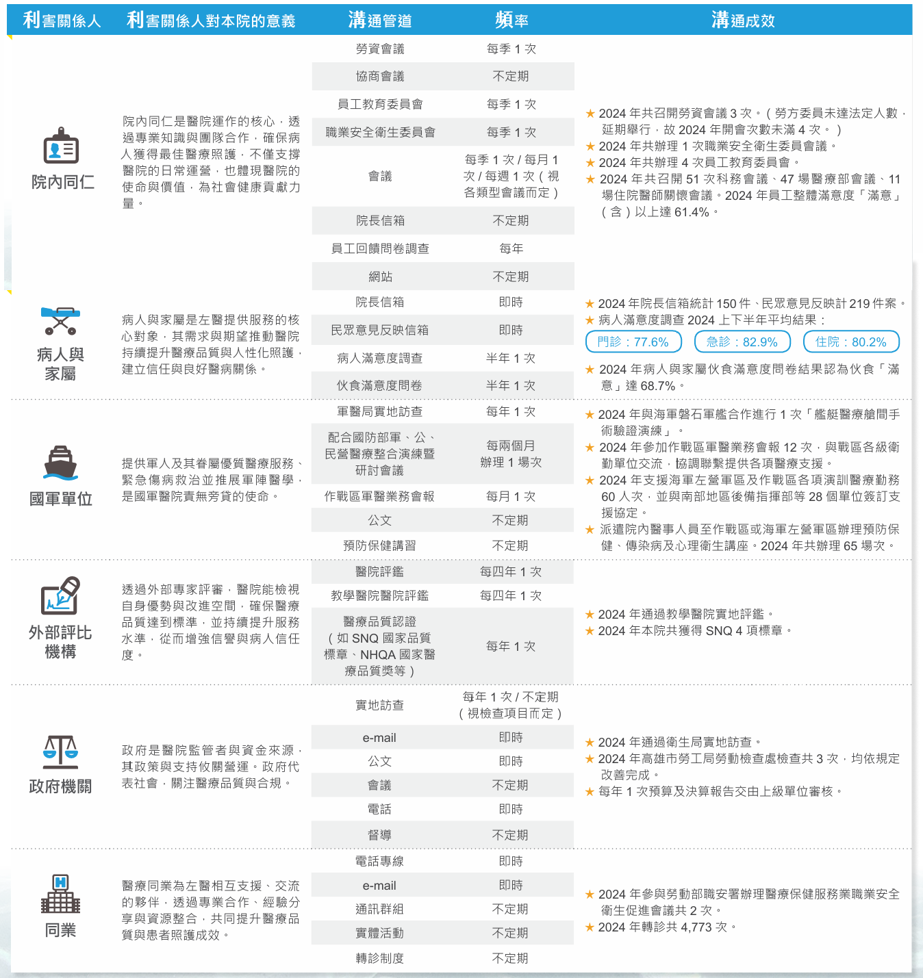 左醫持續深化與利害關係人的溝通機制,透過多元化的交流渠道,積極了解其在治理、環境與社會等面向的關注議題。本院將所蒐集之回饋與建議,納入營運策略與管理方針的制定過程,確保醫院發展方向與利害關係人期望相符,並強化醫療服務的品質與永續性。