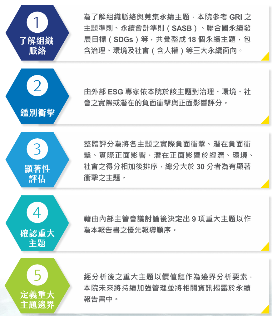 左醫依循全球報告倡議組織(GRI)於2021年發布的《GRI 3:重大主題》準則,導入重大性分析流程,系統性鑑別對醫院營運及利害關係人具有重大影響的永續議題。本院「了解組織脈絡」、「鑑別衝擊」、「顯著性評估」、「確認重大主題」與「定義重大主題邊界」五大步驟進行鑑別。
