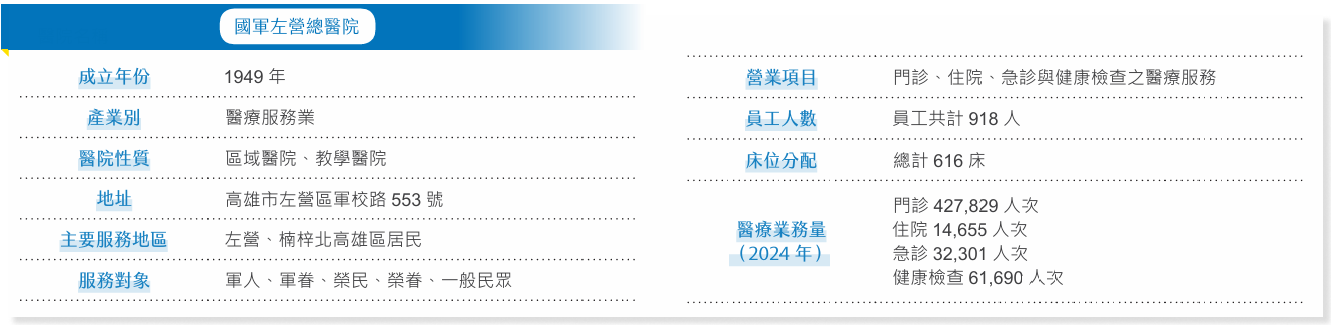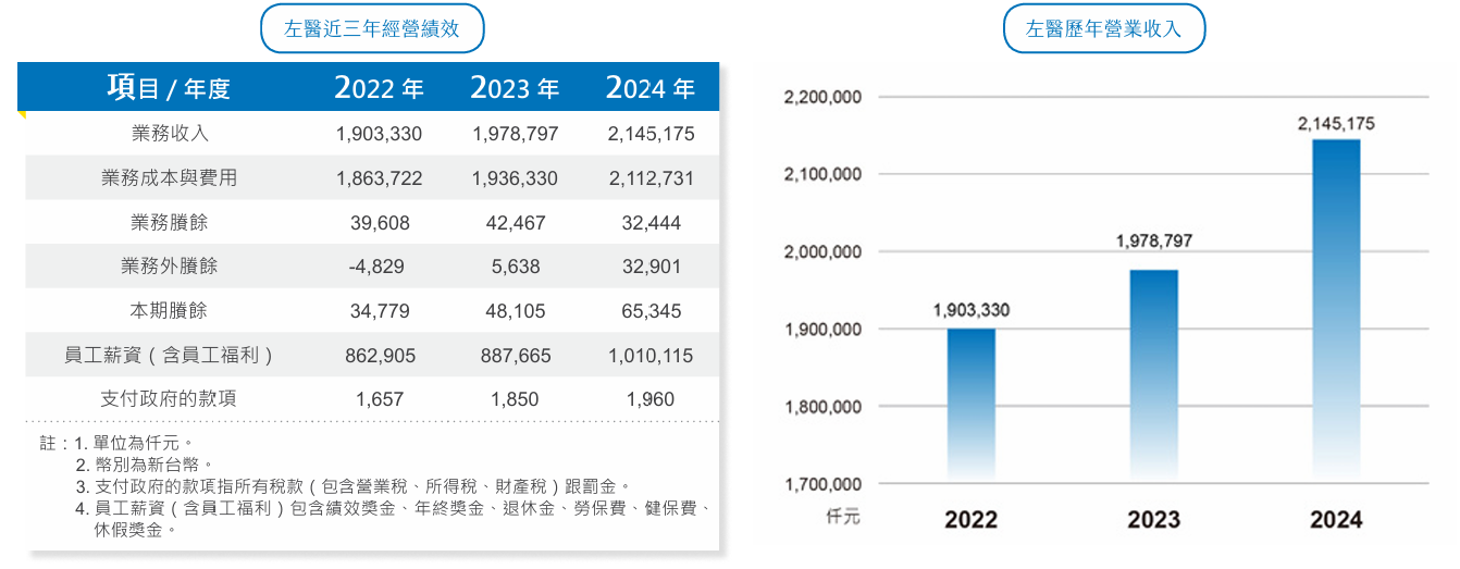 左醫致力於提供高品質的醫療服務,2024年共完成門診427,829人次、住院14,655人次、急診32,301人次,健康檢查61,690人次,營業收入突破新臺幣20億元,並獲得國防部補助逾6億元。