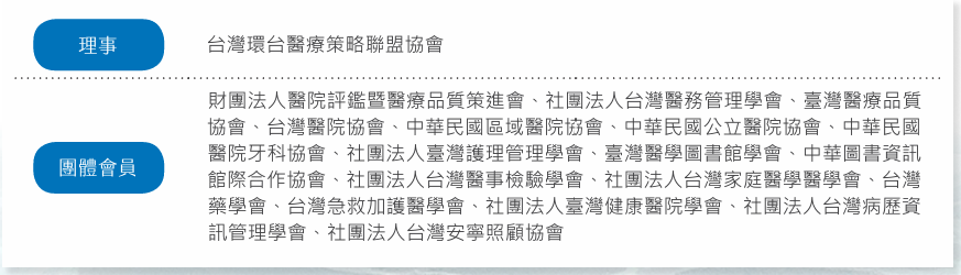 左醫積極參與外部組織,與醫療領域專家攜手推動共同目標,發揮專業影響力,提升整體醫療環境之水準。目前本院共加入18個公協學會及政府機關,並在「台灣環台醫療策略聯盟協會」擔任理事一職,詳列如下表。