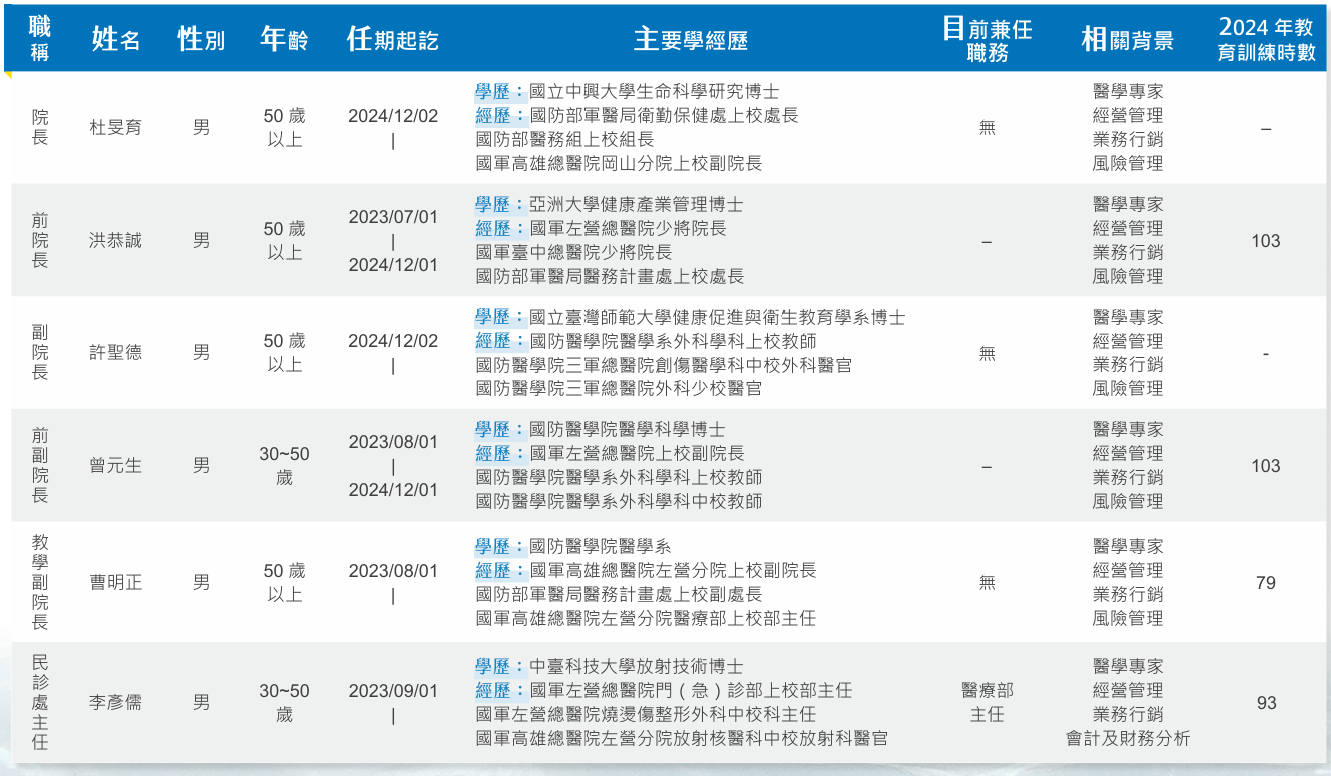 自2024年12月起,杜旻育少將接任院長一職,許聖德上校則出任副院長,延續前任領導團隊的卓越精神,持續推動醫院的管理與發展,帶領左醫邁向更高的醫療品質與服務水準。