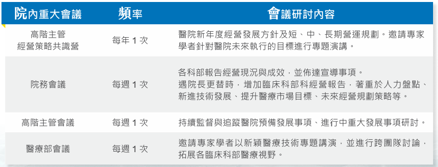 為強化醫院營運策略的溝通與共識,左醫每年舉辦「主管經營策略共識營」,邀請南部各軍醫院參與,透過交流與討論,凝聚共識並研擬醫院經營策略,勾勒出短、中、長期目標,凝聚全院醫護人員共識與向心,造福地區軍民,提升醫療服務效能。此外,本院每週定期召開院務會議、高階主管會議及醫療部會議,針對院內重大決策與日常運作進行規劃與檢討,確保醫院管理效能與醫療品質的持續提升。