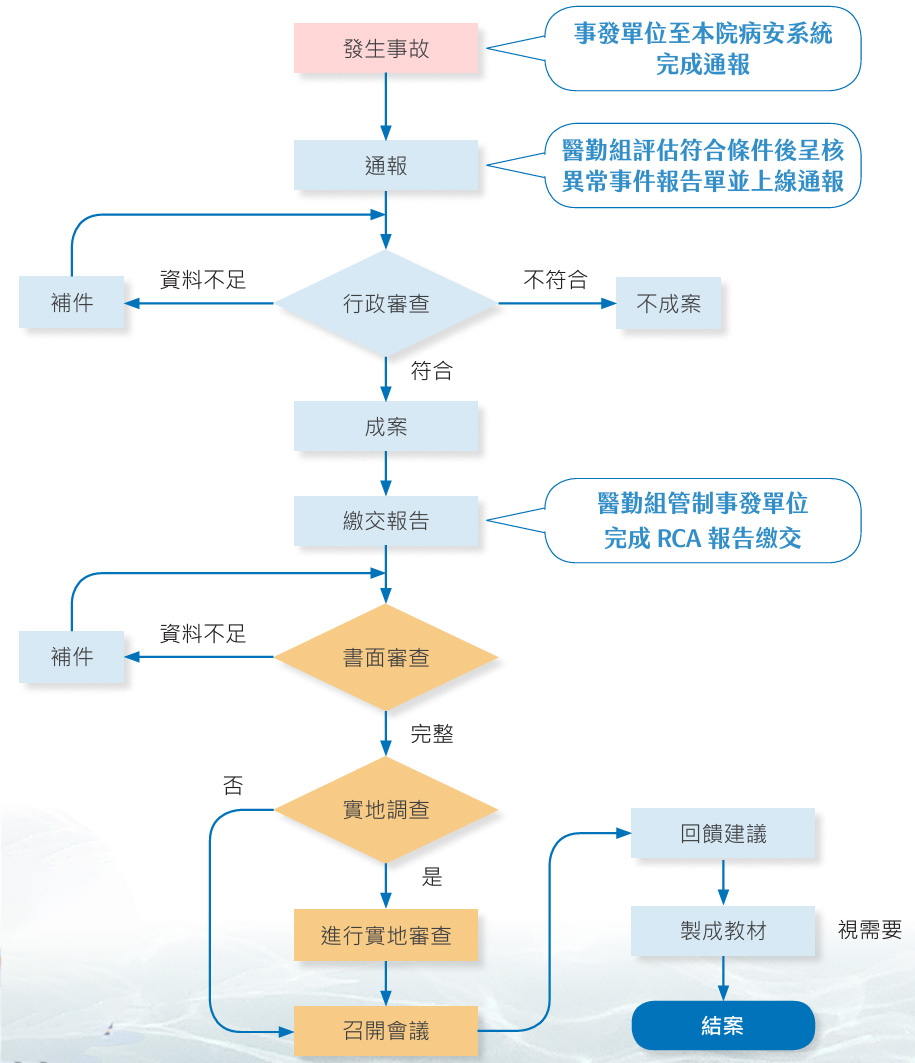- 病人安全事件:依據《重大醫療事故通報及處理辦法》規定,須通報的五類異常病人安全事件,包括手術或侵入性檢查錯誤、不相容血型之血液輸血、藥品處方錯誤、醫療設備使用錯誤等。