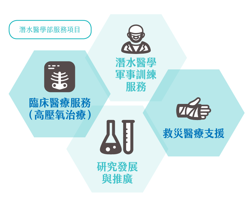 為降低戰時非戰鬥性減員、維持部隊戰力,並在平時確保緊急救護的機動性,本院潛水醫學部團隊全年無休、24小時待命。本院配備全國最大的高壓氧治療艙(多人治療艙),具備其他醫療院所高壓氧艙所無的「子母艙結合,緊急後送」功能。此系統可透過軍艦上的減壓子艙,將傷患經由陸、海、空運送至本院,與治療母艙結合,為嚴重減壓症患者提供即時且持續的治療。