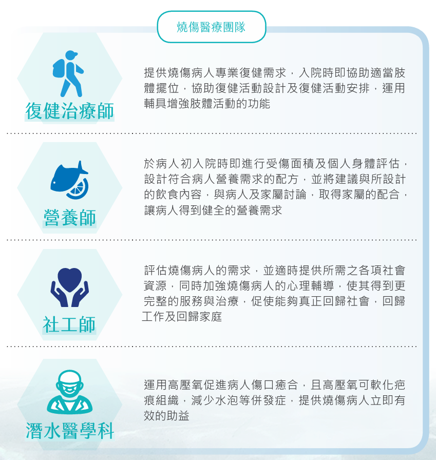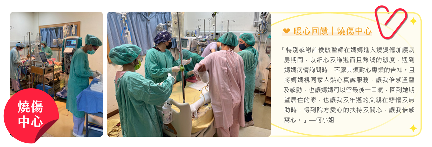 燒傷中心自2017年即獲頒SNQ國家品質標章認證,成立以來歷經多次軟硬體設備更新與空間整建,致力於提供燒傷病患舒適、安全且高品質的治療與照護環境。中心持續與國內外專業機構合作,長期與美國北卡羅萊納州Jacee Burn Center締結為姊妹燒傷中心,並每年與中華民國兒童燙傷基金會及北、中、南三家燒傷專責醫院代表共同舉辦臨床業務報告及學術交流,持續精進臨床技術與醫療品質。