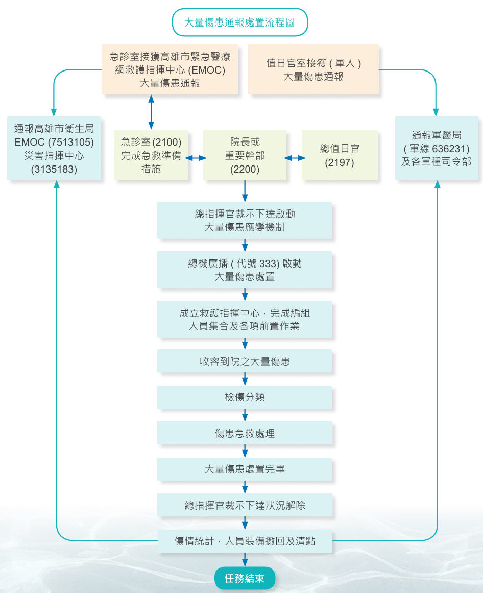 急診入口處設有檢傷分類區,傷患經分類後將依重症程度分送至各專責診療區進行後續醫療處置。各區醫療組長每30分鐘向現場指揮官(即急診室主任)回報傷患處置進度與病情彙整,協助指揮中心即時掌握整體應變狀況,並視需要通報國防部軍醫局、地方衛生局等相關單位。