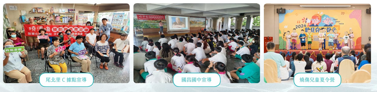 除完善的住院醫療服務外,燒傷中心亦致力於燒燙傷防治與健康促進,積極投入校園、社區與職場之預防教育,以增進社區內幼兒照顧者及一般民眾對燒燙傷預防及急救方式之正確觀念,並強化國中、小學童及民眾對於用火、用電安全以及燒燙傷預防及急救方式之認知。2024年共計辦理燒燙傷預防宣導活動10場,參與人數達750人次。自1996年起更與兒童燙傷基金會攜手合作,持續舉辦燒傷兒童夏令營,透過戶外活動與團體互動,協助病童重建自信、提升社交能力,順利適應學校生活並促進其身心全面復原。