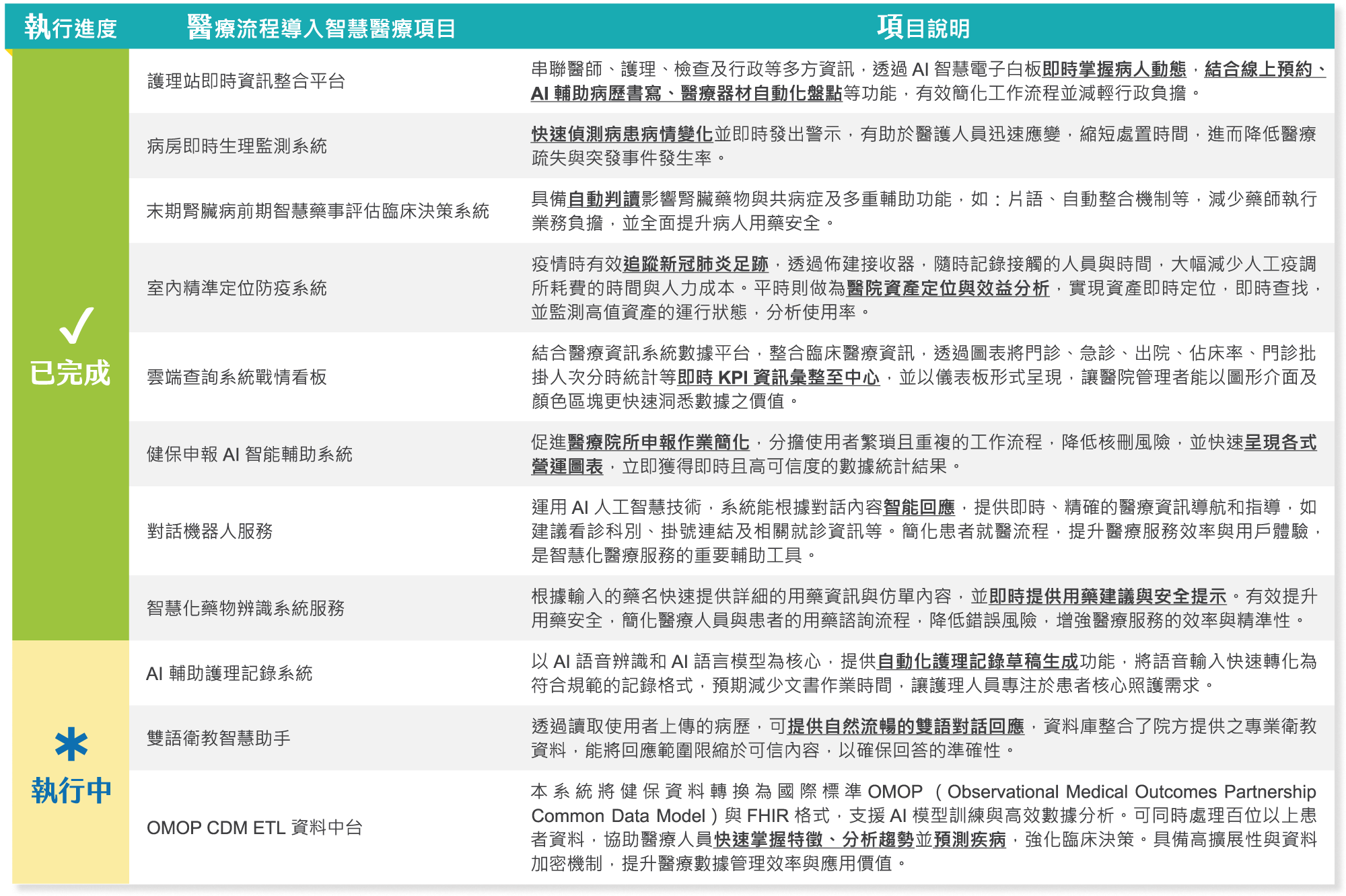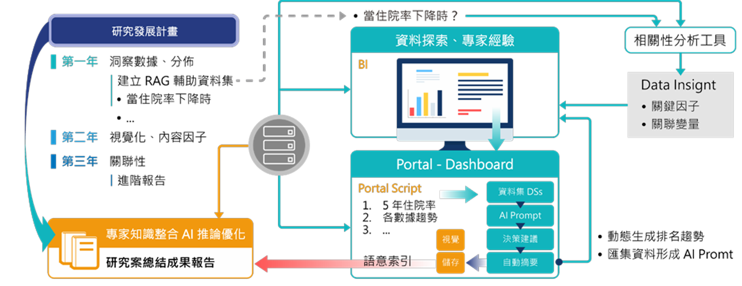 未來,我們將持續應用智慧技術優化醫療流程,並規劃開發多項創新系統,包括去識別化AI照護平台、AI門診高風險病患自動判別與標記系統、智能虛擬助理機器人,以及結合就醫資料與地理資訊的大數據分析平台,以全面提升醫療服務的效率與精準度。