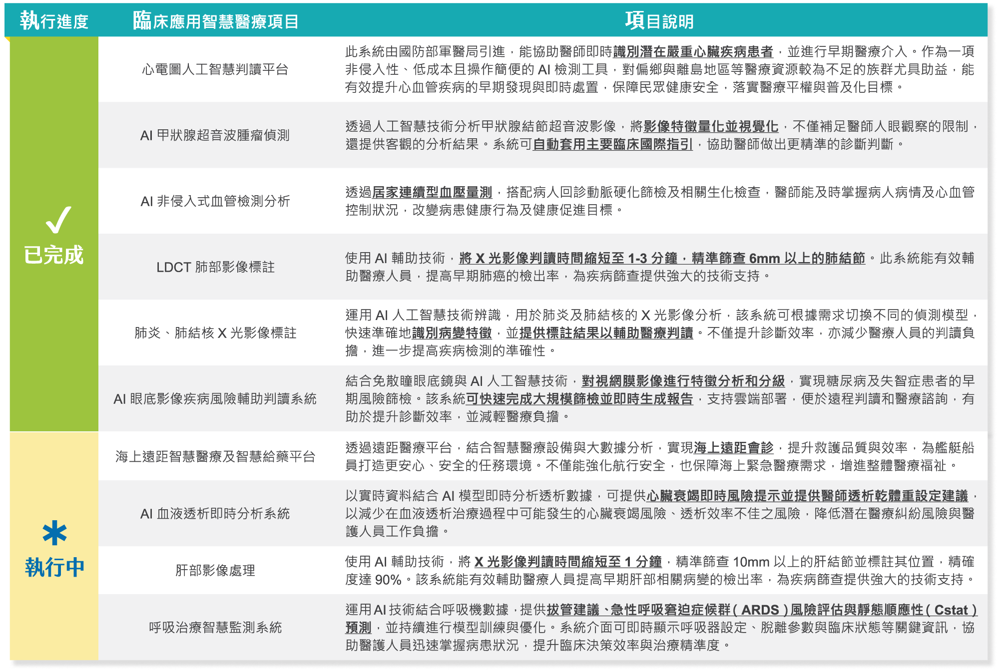 「心電圖人工智慧判讀平台」可於20秒內完成單張心電圖的AI 初步判讀,準確篩檢出50種急慢性心肺疾病風險;目前放射科與病理科則已全面應用AI技術於X光、CT、MRI等影像檢查,AI輔助診斷結果經醫師審核後,整體準確率已達95%以上,並成功縮短病患診療時間約20%。