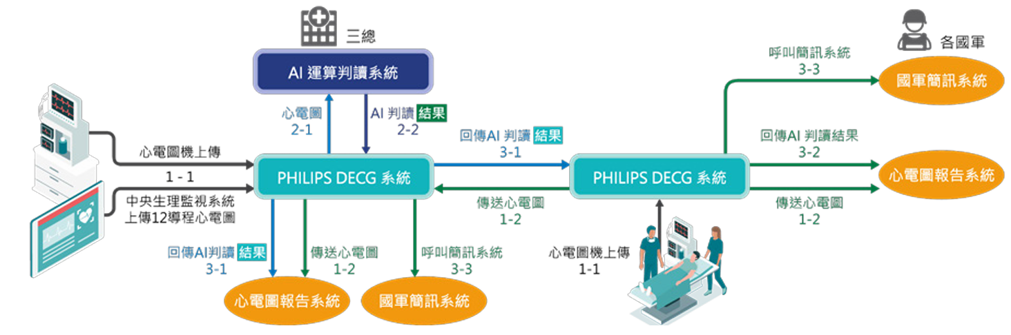 偏鄉離島篩檢處置時序圖(透過三總AI資料庫輔助判讀並回傳至PHILIPS DECG系統)
