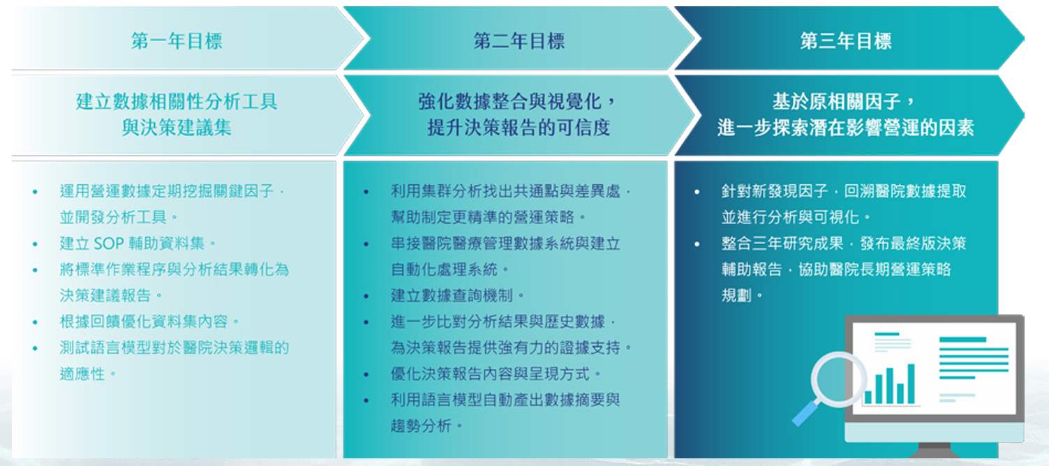 2025年,本院參與國防醫學研究發展計畫—「建構以數據驅動營運資料探勘分析及AI決策輔助資料集」,以數據分析方法探勘資料,提供營運相關決策建議,以人工智慧 (AI) 輔助主管迅速地做出營運決策,並訂定三年計畫目標,藉以建立完善之營運管理系統。