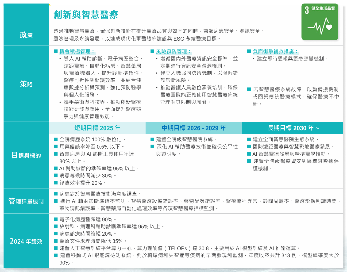 2024 年起,本院更導入資安監控與異常行為偵測系統,至今未發生任何重大資安事件,展現本院在資安治理上的前瞻性與高度韌性,致力為軍民打造安心、智慧且高效的醫療環境。