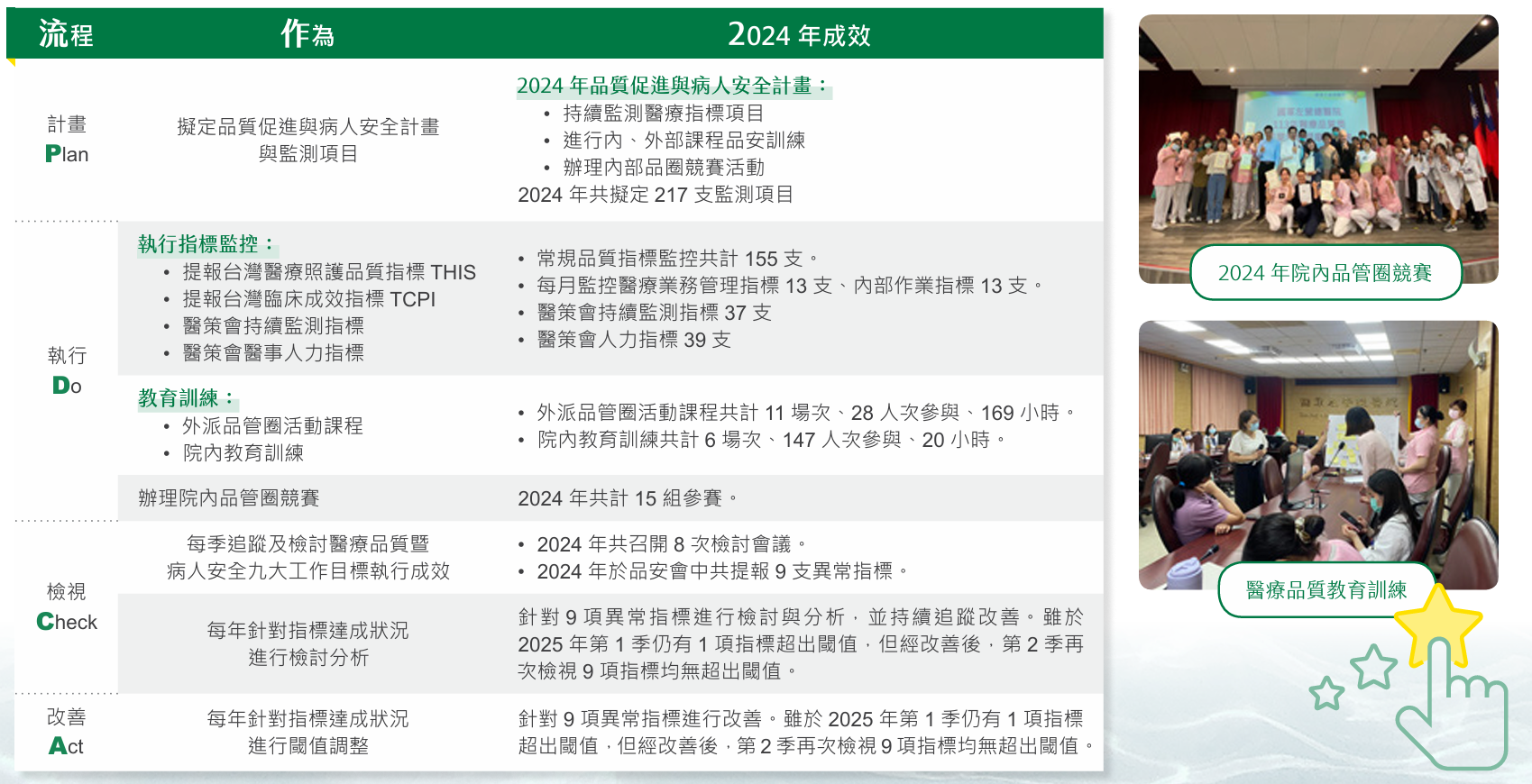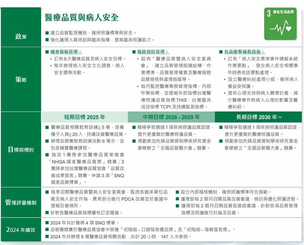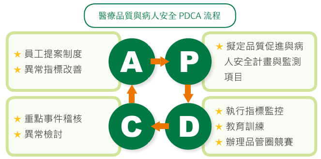 為配合財團法人醫院評鑑暨醫療品質策進會所提出的九大醫療品質與病人安全工作目標,左醫積極推動醫療品質管理體系。透過制定完善的醫療品質與病人安全監測項目,並實施指標監控、定期教育訓練、重點事件稽核、異常檢討及後續追蹤等PDCA循環流程,我們致力於營造以病人為核心的安心就醫環境,100%評估醫療服務對於病人安全之衝擊,確保每一位病患都能接受高品質、無憂的醫療照護。此舉不僅體現我們對病人安全的深切關懷,也展示了我們對高標準照護承諾的執行力。