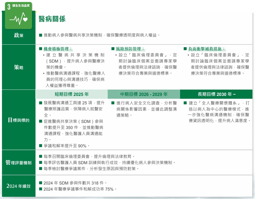 在院內層面,本院已建立SDM平台,醫師可透過平台開立SDM醫囑,並積極推動醫病溝通相關培訓課程,提升醫護人員的溝通能力。對於病患層面,我們鼓勵病患透過就醫提問單與醫師進行雙向溝通,並在每月的團體衛教活動中向民眾宣導醫病共享決策的理念。2024年,本院已制定20項共享決策主題,執行318件SDM案例,並舉辦了17場次的醫病共享決策衛教活動。