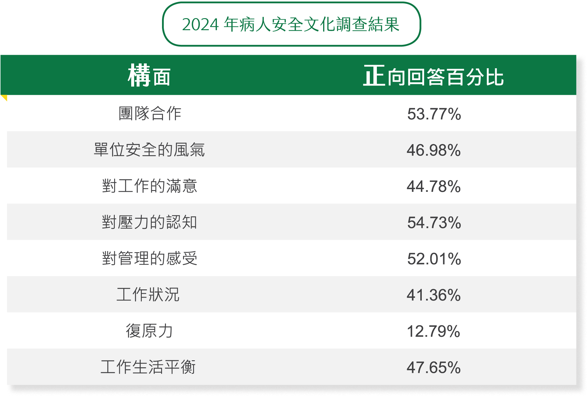 在病人安全文化調查方面,本院對15個單位(包含行政、臨床)進行「全院性」、「八大構面」問卷調查,系統性地蒐集員工對病人安全文化的理解與感受。透過這些資料,我們能夠了解組織各層級對病人安全議題的共識與態度,並反映員工對醫院病安措施的評價,這些寶貴的反饋將作為我們持續優化病安文化的重要依據。