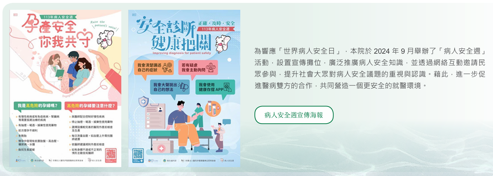 為了確保病人安全,左醫不僅持續強化醫療品質管理措施,還每年定期進行病人安全文化調查與病人安全週活動,積極推廣病人安全相關資訊,在用藥安全方面亦100%依照《藥師法》及相關規範,藥袋標示完整符合衛生福利部所規定的13項內容。透過這些措施,我們旨在預防並減少潛在的風險與負面影響,致力於為病人提供更加安全、信賴的就醫環境。