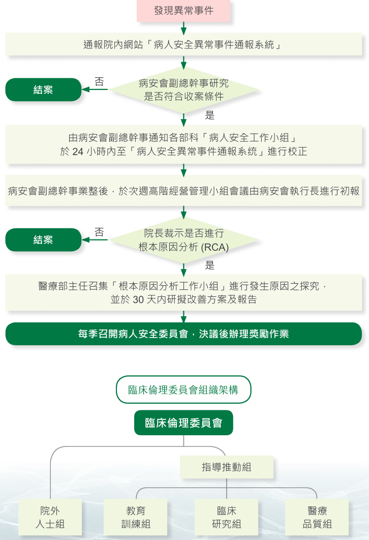 本院制定了《病人安全異常事件通報系統作業要點》,當發生異常個案時,通報人需即時於本院病安通報系統登錄事件詳情。醫勤組的病人安全承辦人將根據相關規範,判定是否屬於重大病安事件。若確定為重大事件,將立即編制病人安全異常事件報告表,並由院長核定,隨後在7日內通報至醫策會的「重大醫療事故通報平台」。事件後續處理中,將召集相關單位代表、病人及其家屬共同參與關懷會議,並由副院長主持根本原因分析(RCA)小組,深入探討事件的根本原因,並制定具體的改善措施。