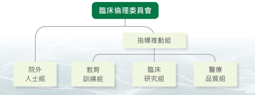 為了貫徹臨床倫理教育、落實全人醫療、提升醫療品質並促進醫病關係,本院設立了臨床倫理委員會,致力於保障病患及其家屬的權益與尊嚴。委員會每半年召開一次會議,並設有由院長擔任主任委員的指導推動組,以及包含院外專業人士的外部組成員。指導推動組負責領導醫療品質組、臨床研究組與教育訓練組,共同協作執行相關工作,確保臨床倫理的落實並提升醫療服務的整體水準。