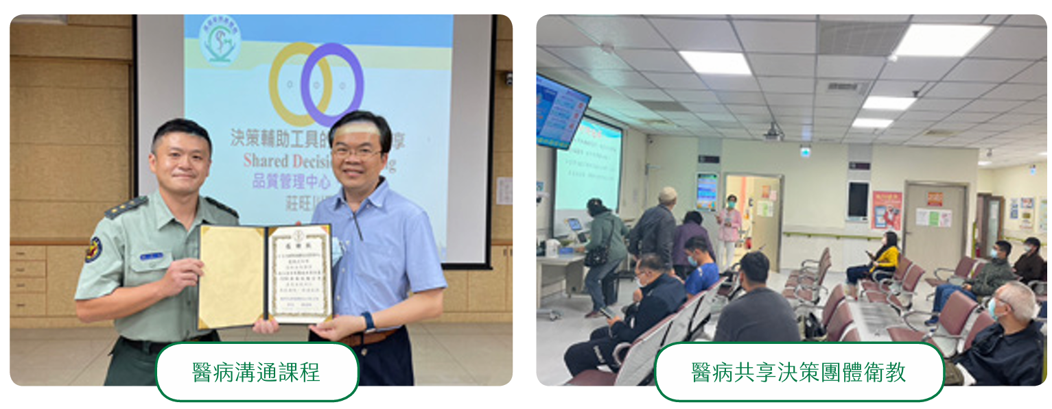 鑑於一般民眾在醫療知識方面的相對匱乏,傳統的就醫模式往往依賴醫師的單方決策與專業建議。當治療結果未如預期時,資訊不對稱的情況容易引發醫病衝突。為了改善這一現象,本院積極推行「醫病共享決策(Shared Decision Making,SDM)」模式,旨在提升病人在醫療過程中的參與感與決策權,促使病患能夠更積極地參與自身健康管理,並與醫療團隊共同做出更符合其需求與期望的醫療選擇。
