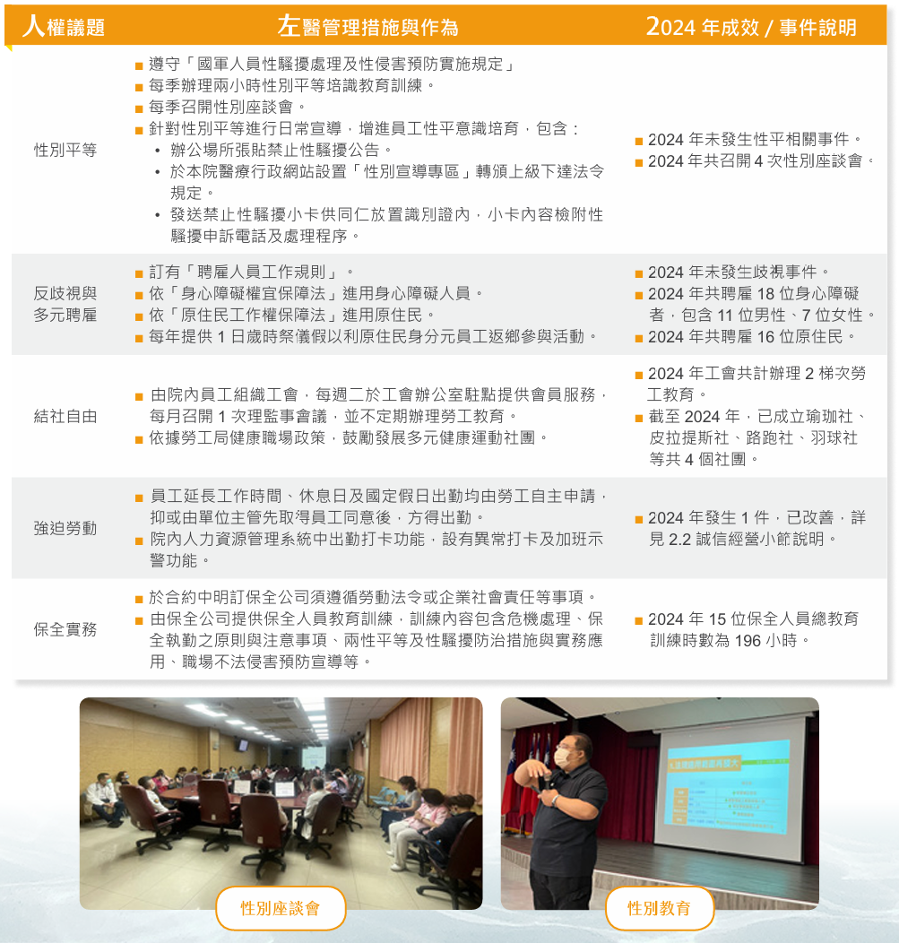 此外,本院每年透過匿名問卷進行員工滿意度調查,作為持續改進的依據。藉由有效的內部溝通與回饋機制,我們致力於建立開放的溝通文化,讓員工可以自由表達想法與建議,並確保管理層能夠及時回應並採取實際行動。2024年,本院員工對於工作整體滿意度調查結果「滿意」(含)以上達到61.4%,這是我們在創建更加和諧、支持性工作環境方面的一個正向指標。
