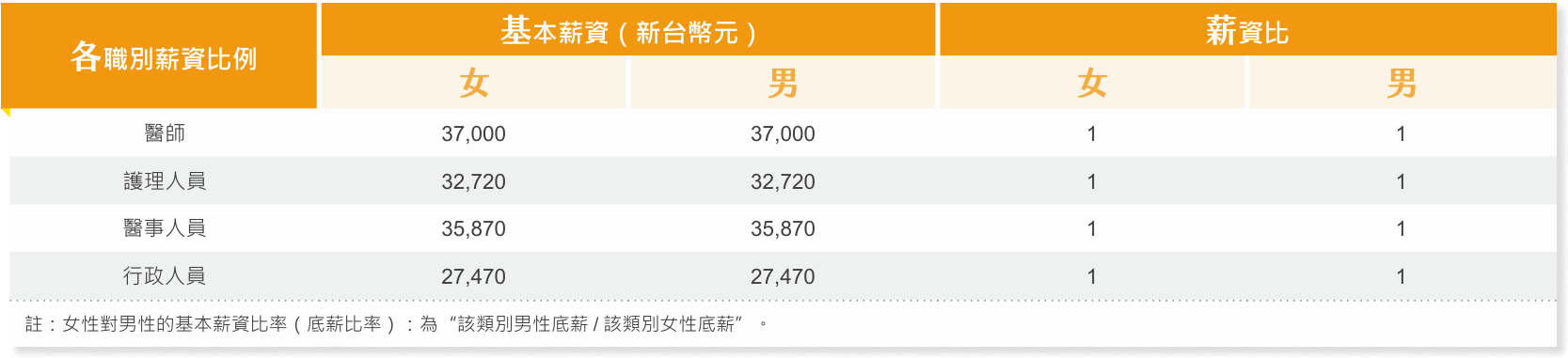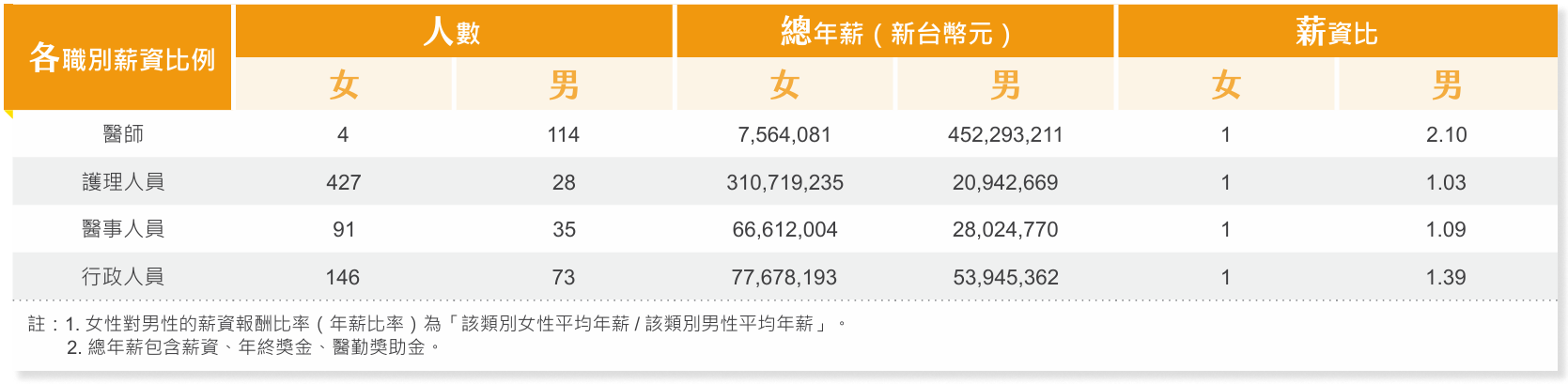 在薪酬結構方面,本院薪酬最高個人的年度總薪酬為全體員工(不包括該最高薪酬者)年度總薪酬中位數的10倍,且薪酬最高者與其他員工年度薪酬中位數之增長比率為0.77。對於基層員工,無論性別,均依照《勞動基準法》規定的最低薪資標準辦理。本院醫師與行政人員男女薪資比差異較為懸殊,主因包括女性醫師人數較少且多未擔任主管職務,以及行政新進人員以女性居多,進而影響整體薪資比率。
