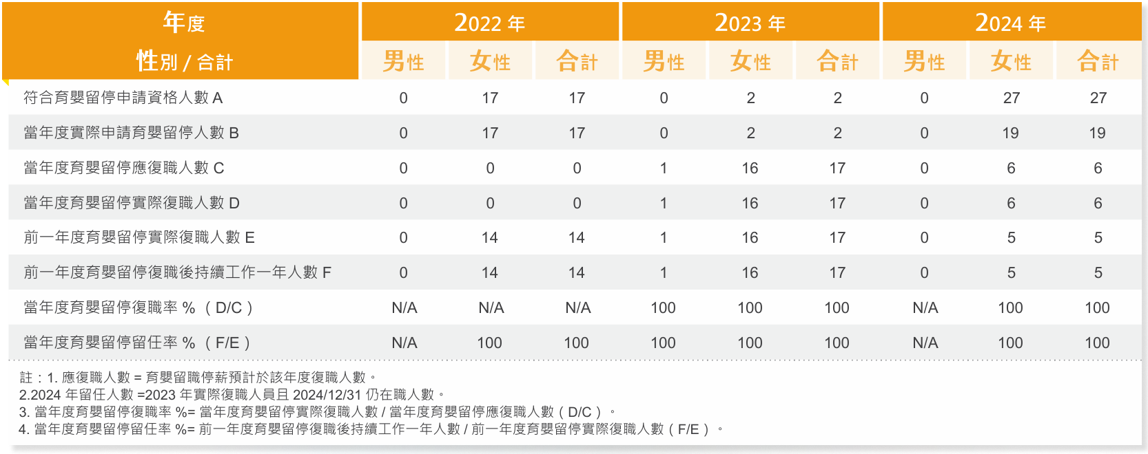 左醫秉持《性別工作平等法》原則,無論職務或性別,所有員工皆可申請育嬰留職停薪。我們深知家庭與工作之間的平衡對員工的重要性,因此提供靈活的政策支持。2024年,共有27位員工符合育嬰留職停薪資格,其中19人實際申請,且所有申請者在育嬰留停結束後均順利返回工作崗位,復職率及留任率達到100%。彰顯了我們對員工家庭需求的理解與支持,也證明了我們致力於提供一個既具包容性又有彈性的工作環境,讓員工在事業發展的同時,能夠更好地照顧家庭。