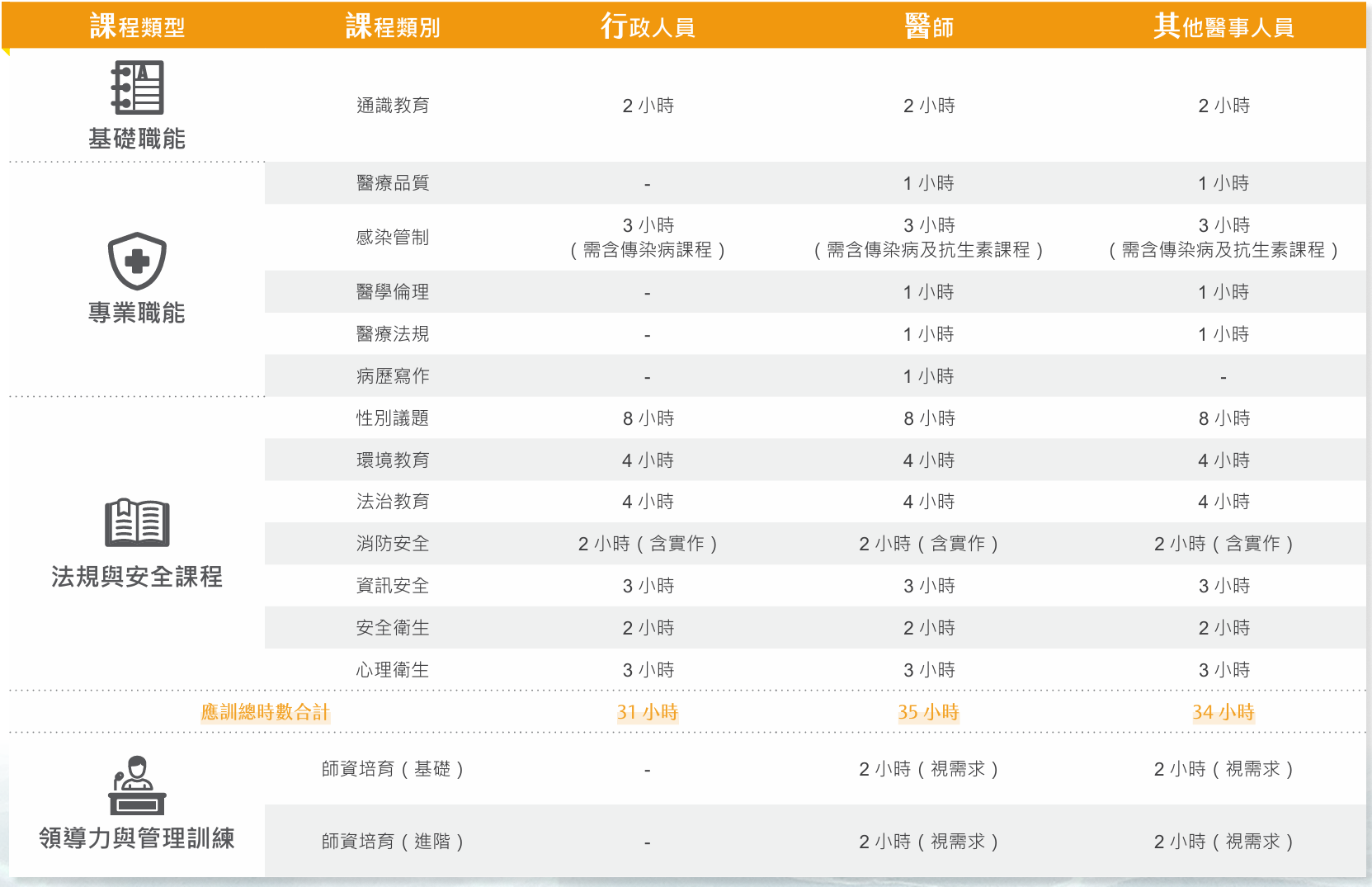 對於在職員工,本院則依據「員工教育訓練計畫」,為不同職類的員工設計必修課程,依照課程類型區分為5大領域,分別為基礎職能訓練、專業職能進修、ESG相關課程、法規與安全課程、領導力與管理訓練。為因應社會發展趨勢,本院通識教育類課程不定期新增相關主題,如ESG訓練、ChatGPT應用等課程,以利同仁掌握新興議題與數位工具,提升跨領域知能與工作效能。課程結束後,員工將完成線上滿意度問卷調查與線上測驗。針對院外教育訓練,由醫院派任或員工自行參與,並在完成課程後提交心得報告。2024年,我們的員工教育課程平均滿意度為4.58(5點量表),展現了我們在專業培訓領域的努力與成效。
