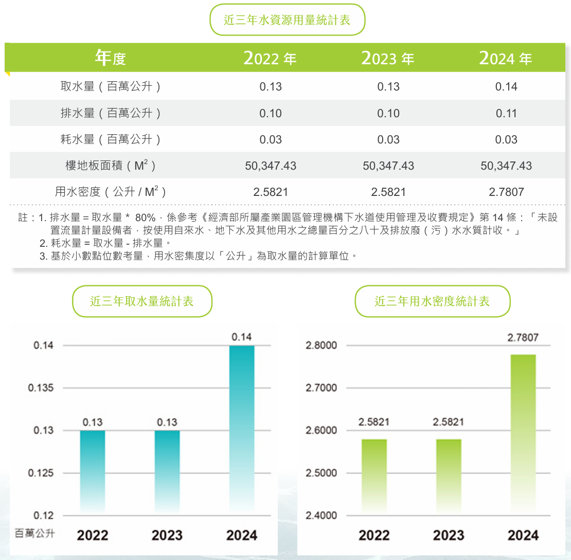 左醫位於高雄市左營區,自來水供應來自坪頂給水廠,水源取自高屏溪。2024年度,本院的總取水量為0.14百萬公升,排水量為0.11百萬公升。根據世界水源風險地圖「Aqueduct Water Risk Atlas」,本院所在區域屬於中低風險區域,顯示我們對水資源的管理及利用持續處於穩定的狀態。作為負責任的醫療機構,左醫始終重視水資源的有效運用,並持續致力於節約與保護水源,以保障醫療服務與環境永續。
