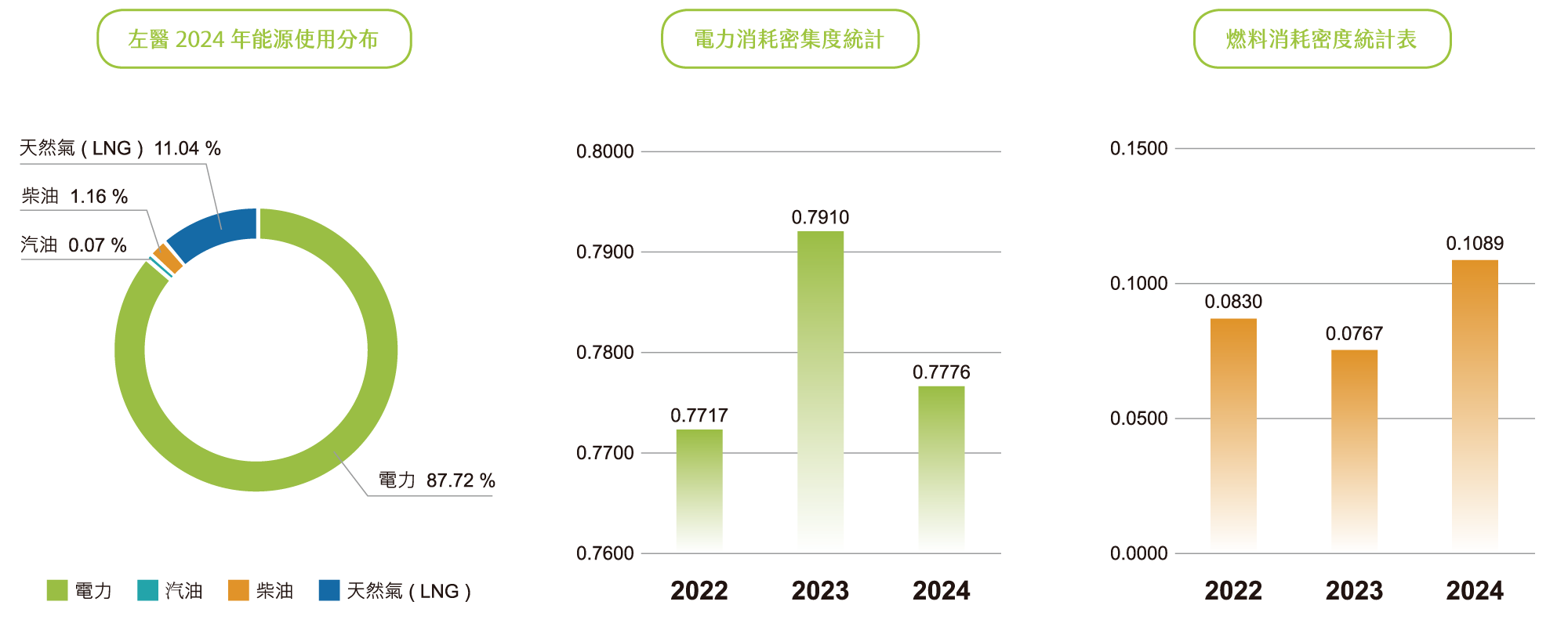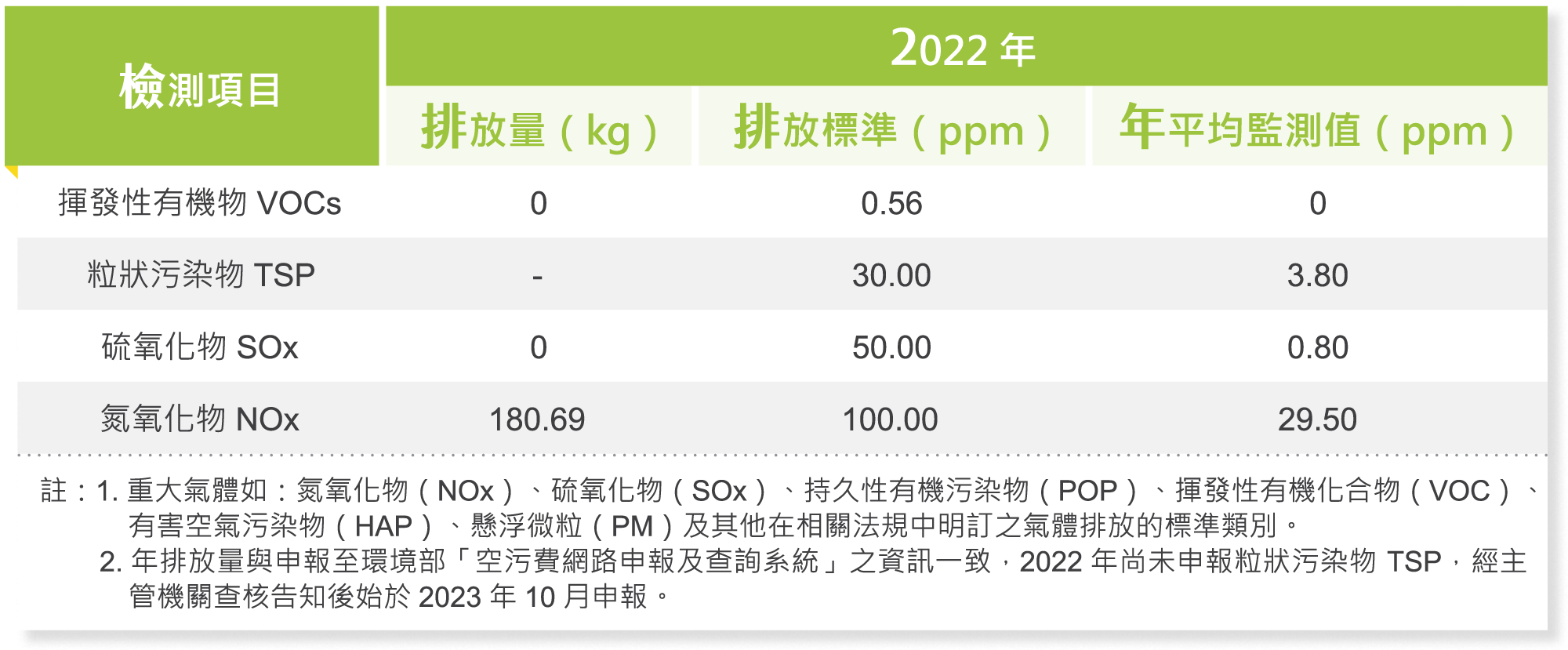左醫的空氣污染排放源主要來自天然氣鍋爐,使用的原料為自來水。根據操作許可證的要求,需於展延前進行排放檢測。上次的排放檢測已於2022年完成,結果顯示所有排放指標均低於環保標準。下一次的排放檢測計劃將於2027年進行。