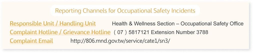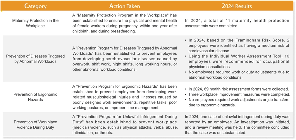 Zuoying Armed Forces General Hospital actively supports the Occupational Safety and Health Administration’s promotion of the “Four Major Labor Health Protection Programs” and fully implements the following key programs: the Maternity Protection Program, the Prevention Program for Diseases Caused by Abnormal Workloads, the Ergonomic Hazard Prevention Program, and the Prevention Program for Unlawful Infringement During Duty. These programs aim to ensure full health and safety protection for employees in all work environments through systematic management and continuous monitoring. Understanding that employee health and safety are the foundation of medical service quality, the hospital is committed to creating a workplace culture that values both physical and mental well-being and continues to strengthen workplace health protection to provide a safe, supportive, and respectful work environment.