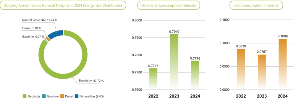 In 2024, Zuoying Armed Forces General Hospital’s total energy consumption was 44,632.17 GJ, with an energy intensity of 0.8865 GJ/m². The majority of energy use came from electricity, accounting for approximately 87.72% of total consumption. The hospital actively supports the net-zero carbon goal and follows the international standard ISO 14064-1:2018 for greenhouse gas inventory. A comprehensive greenhouse gas emissions inventory is conducted and verified by a third-party organization. In 2024, the hospital’s total greenhouse gas emissions amounted to 5,796.21 metric tons.