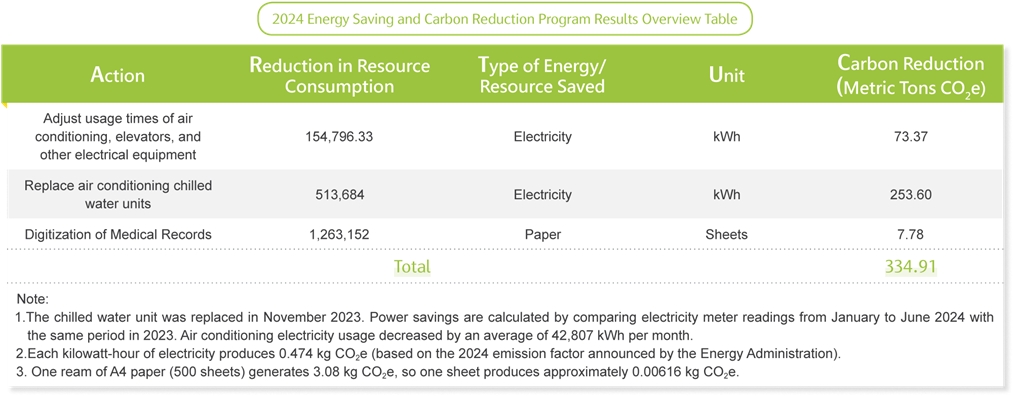 To achieve this goal, the hospital has adjusted the operating hours of electrical equipment, replaced chilled water units, promoted the digitization of medical records, and implemented telemedicine—all aimed at improving energy efficiency and reducing carbon emissions. Through these proactive carbon reduction actions, the hospital successfully reduced 334.91 metric tons of CO₂e in 2024, marking a significant step toward a greener and more sustainable healthcare environment. Zuoying Armed Forces General Hospital will continue its environmental sustainability efforts and, on this foundation, strive to create a healthier society and environment for the future.