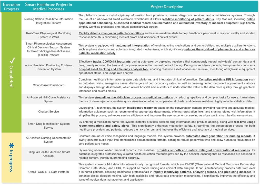 In the future, we will continue leveraging smart technologies to optimize medical workflows and plan the development of several innovative systems, including de-identified AI care platform, AI-based outpatient high-risk patient auto-identification and tagging system, intelligent virtual assistant robot, and big data analytics platform that integrates medical records with geographic information. These advancements aim to comprehensively enhance the efficiency and precision of healthcare services.