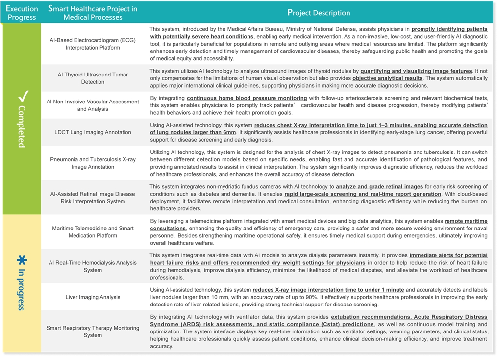 In addition to actively collaborating with industry, academia, and research institutions to develop diverse smart healthcare systems, Zuoying Armed Forces General Hospital continuously explores the potential applications of AI, telemedicine, and real-time data analysis in the field of military medicine. Following the strategic guidelines of the Medical Affairs Bureau of the Ministry of National Defense, the hospital is dedicated to building AI-powered healthcare systems with battlefield applicability to enhance the hospital’s technological support capabilities in military medical response, battlefield injury assessment, and casualty evacuation, positioning the hospital as a key pillar in advancing smart military medicine.