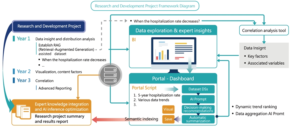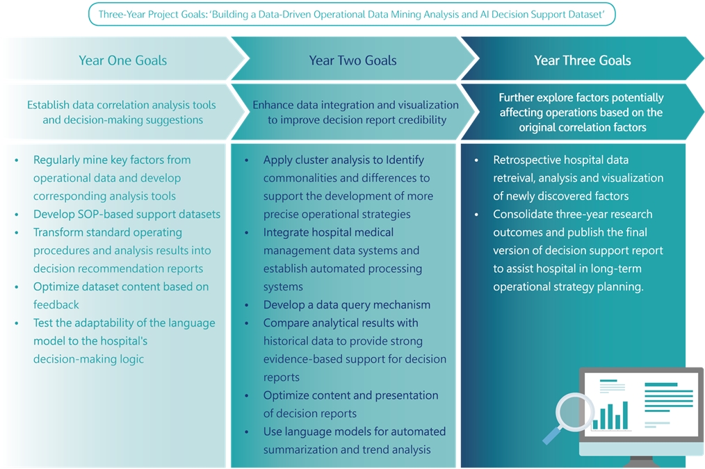 In 2025, the hospital participated in the National Defense Medical Research and Development Project – ‘Building a Data-Driven Operational Data Mining Analysis and AI Decision Support Dataset’, utilizing data analytics to mine operational data and provide insights for strategic decision-making. By integrating AI, the system supports hospital administrators in making timely and informed operational decisions, and developing three-year project goals with the aim of building a comprehensive operational management system.