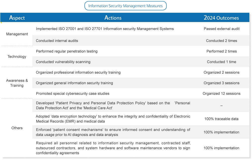 In order to strengthen information security and protect patient privacy, our hospital has obtained ISO 27001 and ISO 27701 information security management system certifications, and established an ‘Information Security Management Committee’. We have formulated the ‘Patient Privacy and Personal Data Protection Policy’, strictly adhering to the ‘Personal Data Protection Act’ and the ‘Medical Care Act’. A dedicated cybersecurity team is responsible for implementing information security policies, conducting regular penetration tests and incident response drills to proactively defend against cyberattacks and data breaches, ensuring the stability and security of the hospital’s medical information systems. Since 2024, the hospital has further implemented information security monitoring and anomaly detection systems, with zero major cybersecurity incidents reported to date, demonstrating our forward-looking vision and high resilience in cybersecurity governance. We remain committed to building a safe, intelligent, and efficient medical environment for both military personnel and civilians.