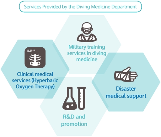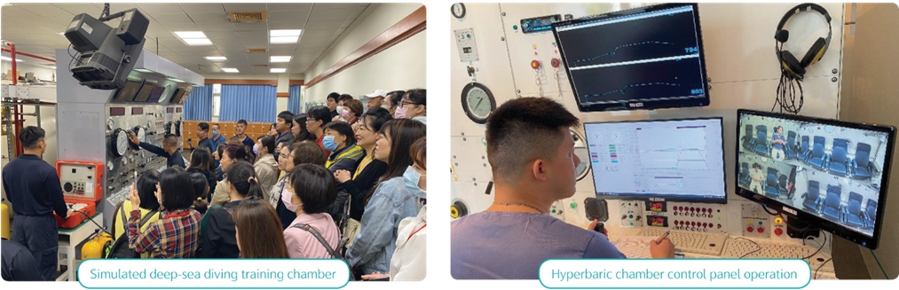 After years of development, the Diving Medicine Department was upgraded from a division to a full department in 2005. Its services expanded from exclusively supporting naval divers to also serving civilian divers and patients requiring hyperbaric oxygen therapy. In 2014, it was awarded the Symbol of National Quality (SNQ) certification, recognizing its outstanding professional performance in the fields of diving medicine and hyperbaric therapy. In 2025, the department will be further upgraded into the Diving Physiology Training Center, with the goal of transforming into a certified institution for diving medicine, enhancing its saturation diving training capacity, and expanding its role in diving medicine.