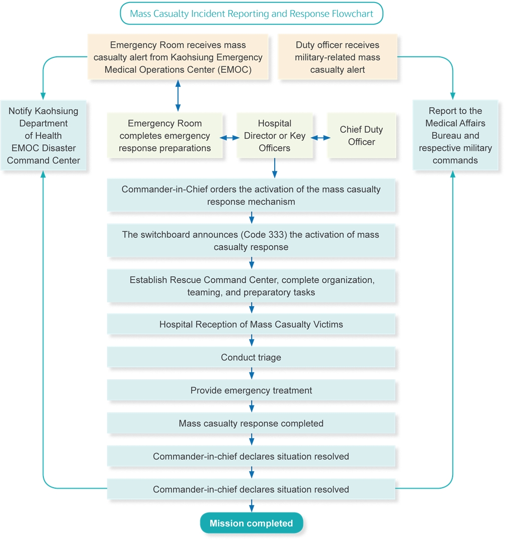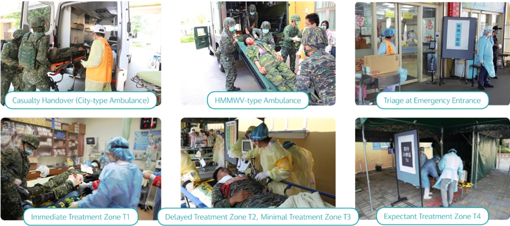 At the emergency entrance, a triage area is established where patients are categorized and directed to the designated treatment zones based on the severity of their injuries. Medical team leaders in each area report every 30 minutes to the on-site commander (the Emergency Department Director), providing updates on treatment progress and patient conditions. These updates assist the command center in maintaining real-time awareness of the overall emergency response and, when necessary, notifying relevant authorities such as the Medical Affairs Bureau, Ministry of National Defense, and local health departments.