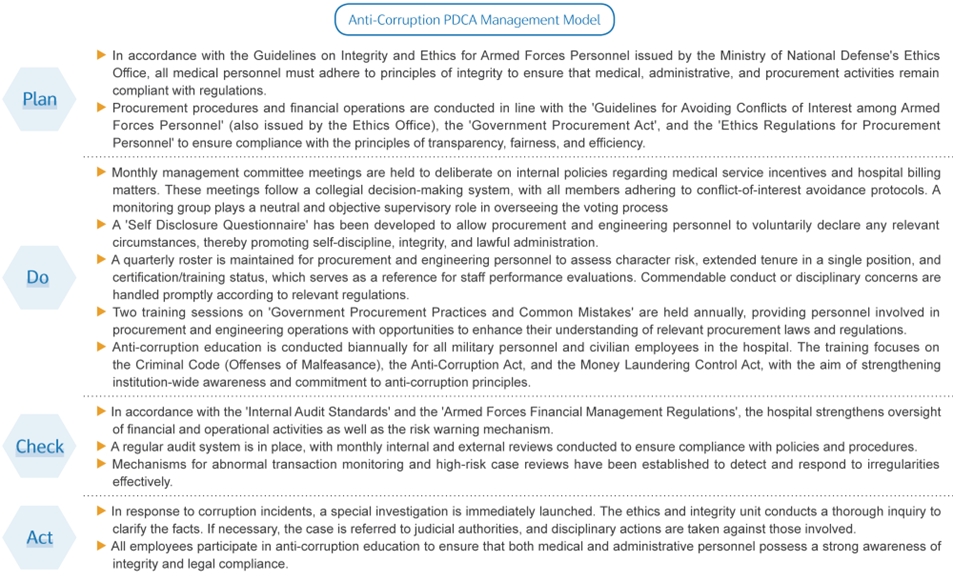 As a key support unit within the national defense healthcare system, Zuoying General Hospital strictly adheres to the integrity and ethical guidelines issued by the Ministry of National Defense. High-risk units, such as procurement, finance, and pharmaceutical management, are subject to targeted risk evaluations and reinforced supervisory mechanisms. These measures ensure transparency and regulatory compliance in operational execution, further enhancing the effectiveness of the hospital’s integrity management.