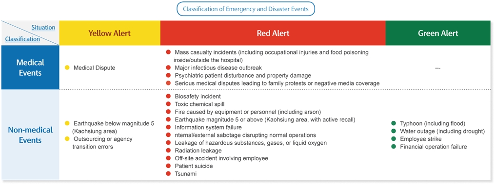 For emergency disaster events (including both medical and non-medical), the hospital classifies incidents into red, yellow, and green levels based on the response time and the crisis impact level. According to the designated level, the hospital promptly assesses healthcare needs and deploys corresponding manpower resources in order to ensure the continuity and stability of healthcare services.