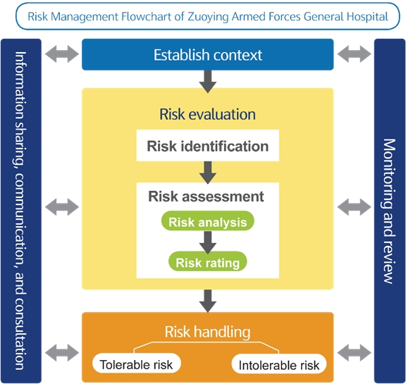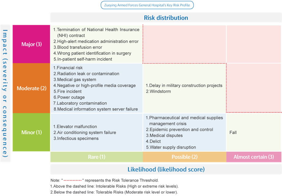 In order to strengthen risk management and crisis response mechanisms, Zuoying Armed Forces General Hospital has established a Risk Management and Crisis Response Task Force, chaired by the Superintendent as the head of steering group, and is responsible for coordinating the implementation of related policies and strategies. A risk management and crisis handling review meeting is held every six months to evaluate the effectiveness of mitigation efforts for identified risks. During the review, each risk is assessed based on its impact level and likelihood of occurrence to determine whether the risk level has been effectively reduced. This mechanism enhances the hospital’s capability to identify and respond to risks, thereby ensuring operational stability and patient safety.
