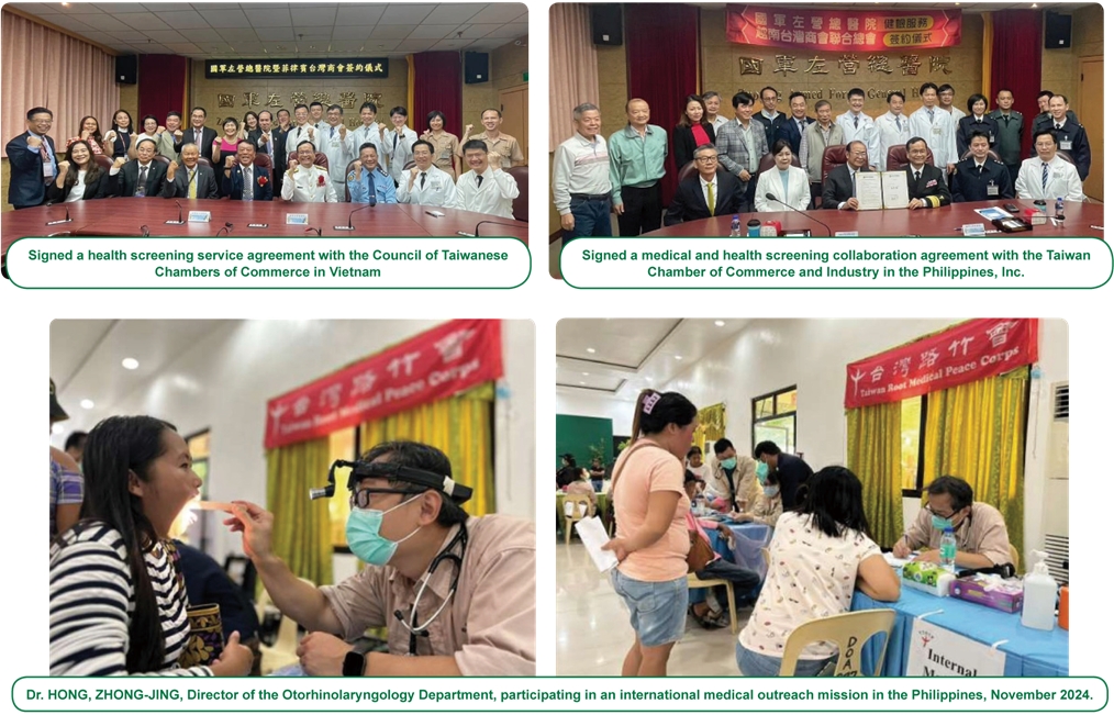 To better serve Taiwanese businesspeople working overseas, the Hospital signed a health screening service agreement with the Council of Taiwanese Chambers of Commerce in Vietnam (CTCVN) in 2024, and established a medical and health screening collaboration agreement with The Taiwan Chamber of Commerce and Industry in the Philippines, Inc. (TCCI). Through these partnerships, the Hospital actively expands its connections and cooperation models with Taiwanese chambers worldwide, delivering high-quality health screening services and continuously strengthening its capacity to safeguard the health of Taiwanese nationals abroad.