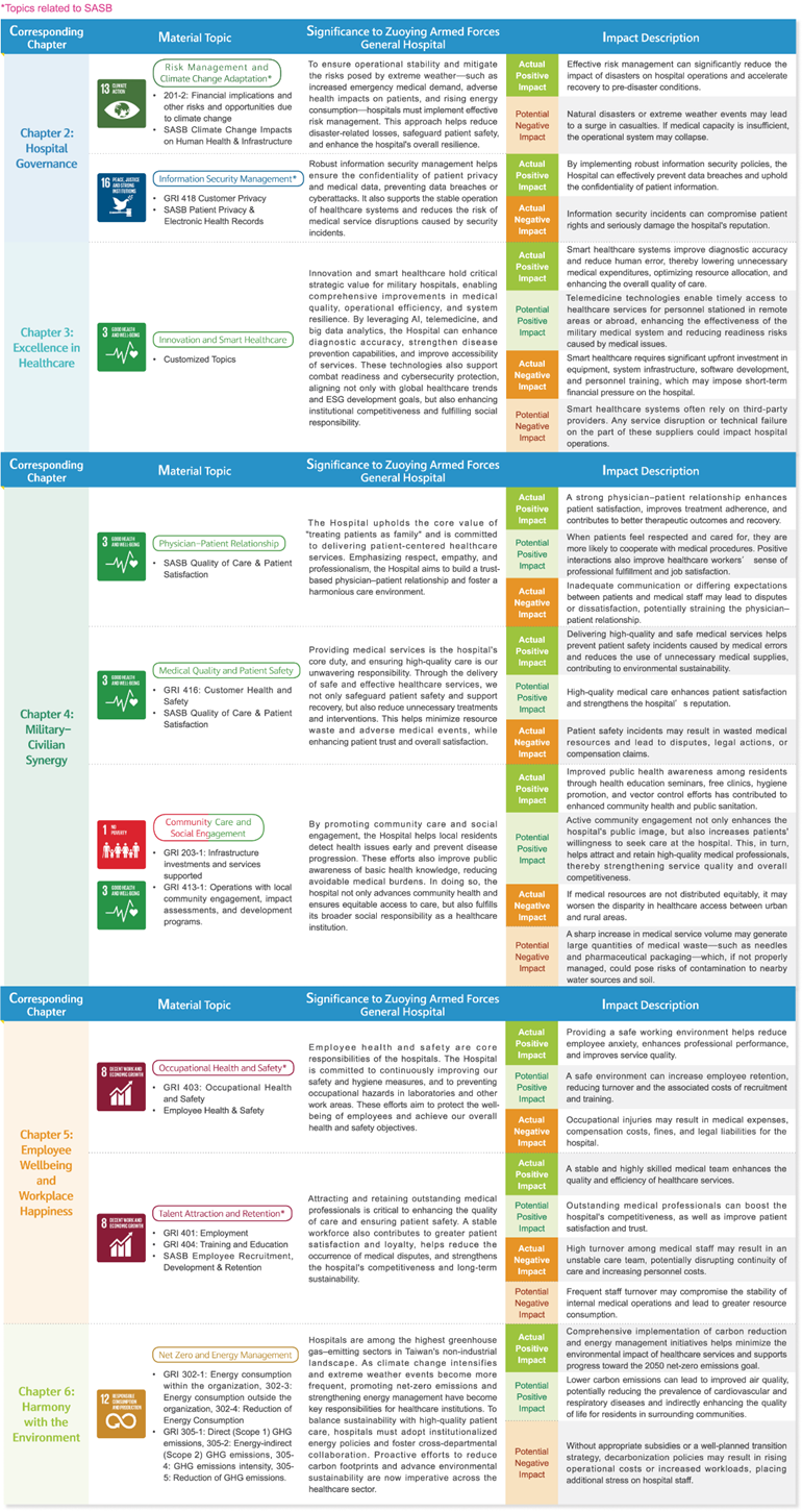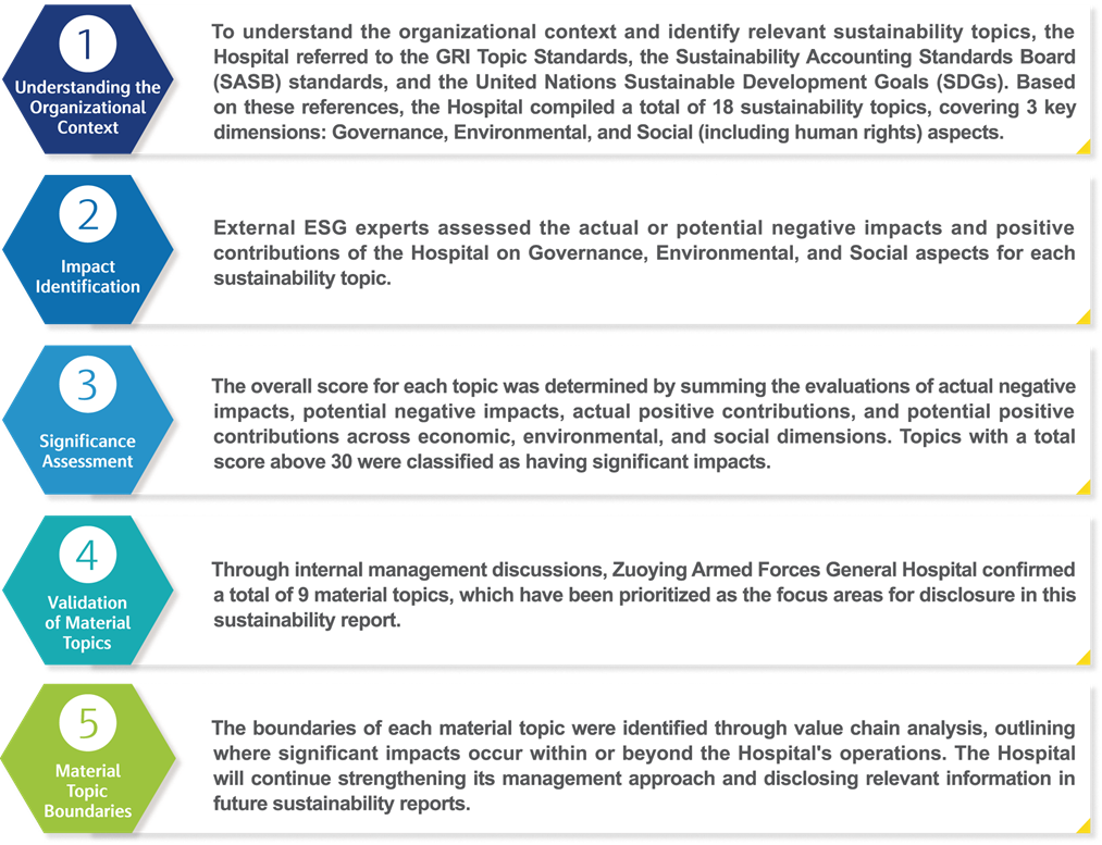 Zuoying Armed Forces General Hospital adopted the GRI 3: Material Topics (2021) standard issued by the Global Reporting Initiative (GRI), and referenced industry-specific standards from the Sustainability Accounting Standards Board (SASB) to guide its materiality assessment process. This systematic approach was used to identify sustainability topics that have significant impacts on both hospital operations and stakeholders