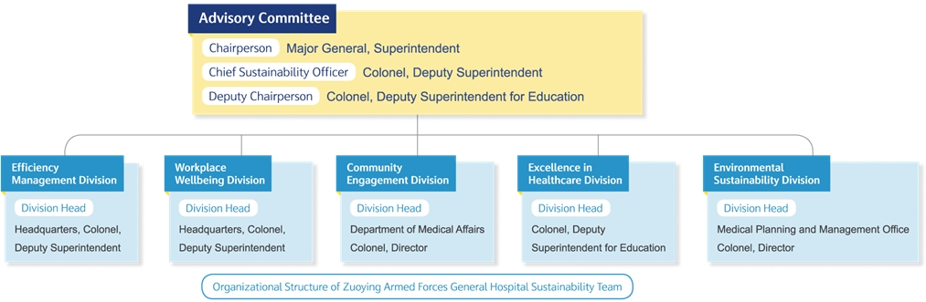 To implement its sustainability vision, Zuoying Armed Forces General Hospital established a Sustainability Team in 2024 and set up a dedicated Sustainability Office to coordinate all hospital-wide sustainability initiatives. The team regularly reviews high-priority topics and sustainability goals, while overseeing and updating ESG-related action areas and performance indicators.